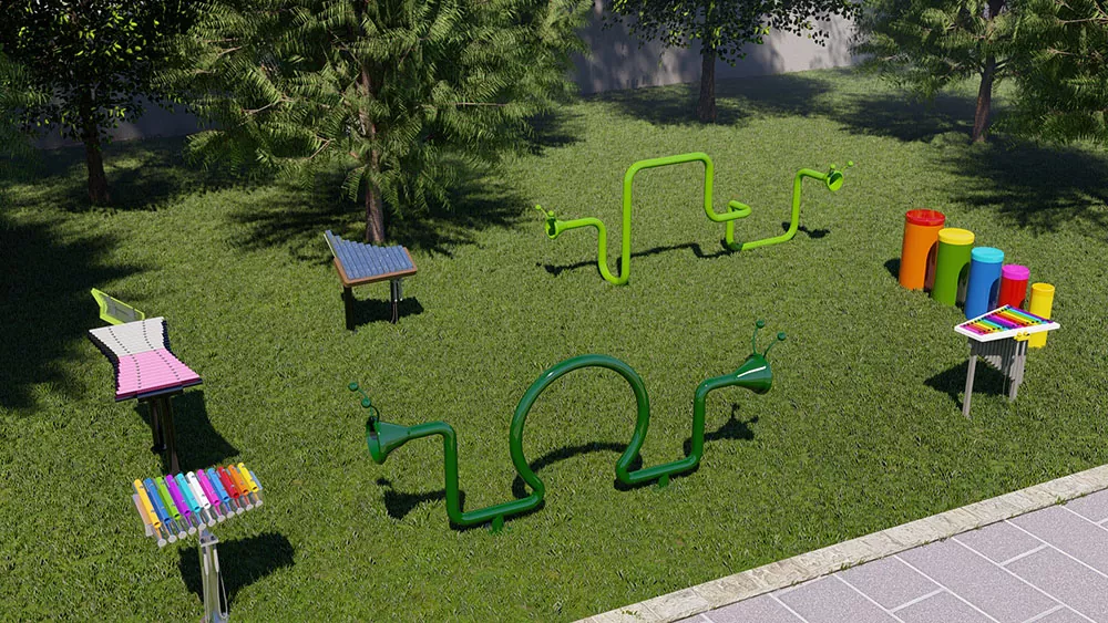 آؤٹ ڈور میوزک پلے گراؤنڈ کا سامان اندردخش کی بورڈ کو ڈور اور آؤٹ ڈور کھیل کے میدانوں ، اسکول کے کھیل کے میدانوں ، یا کنڈرگارٹن کھیل کے علاقوں میں خالی دیواروں کے ساتھ استعمال کیا جاسکتا ہے۔ بیرونی ٹکراؤ کے دیگر آلات بھی مجموعہ میں استعمال ہوسکتے ہیں۔